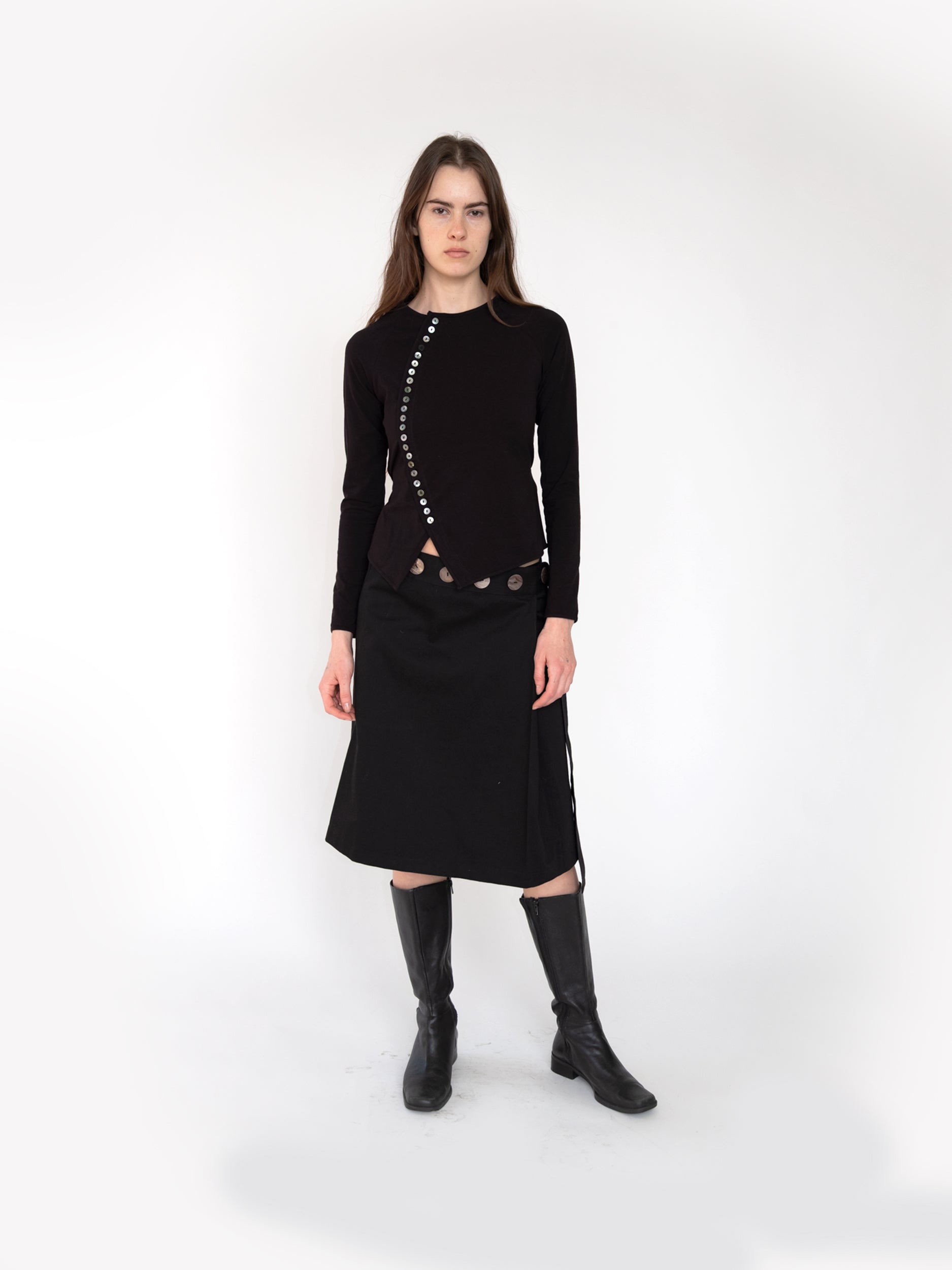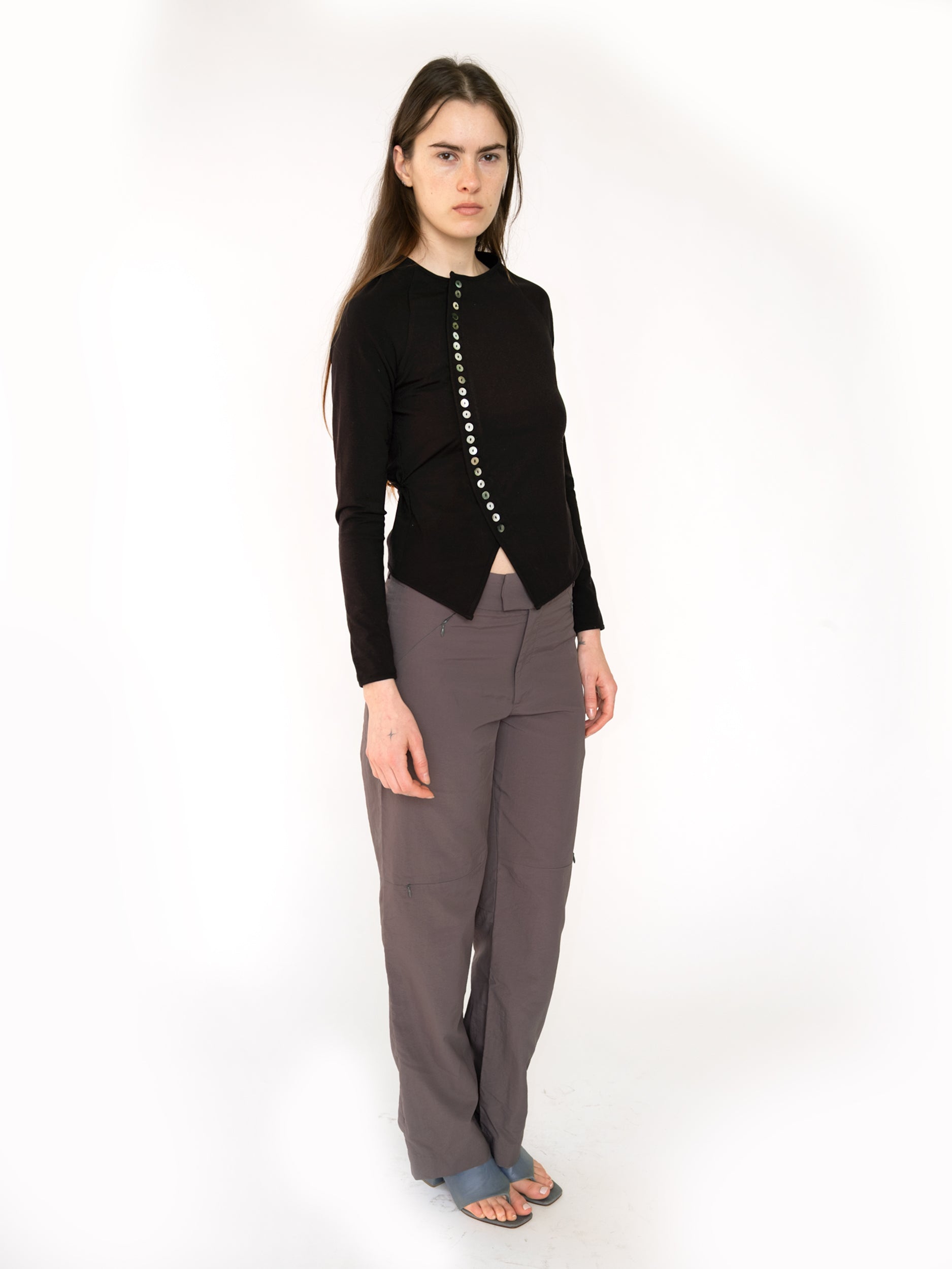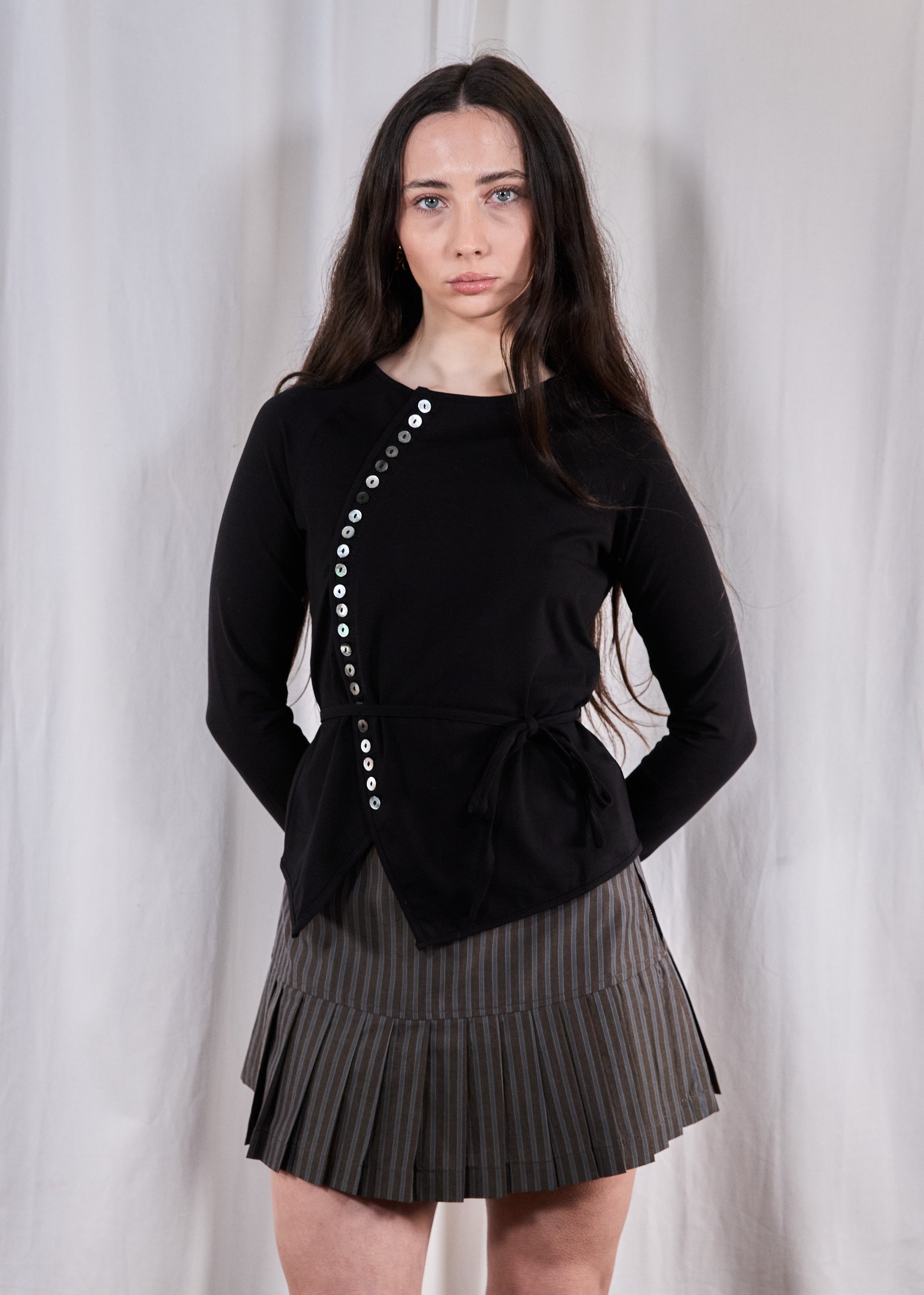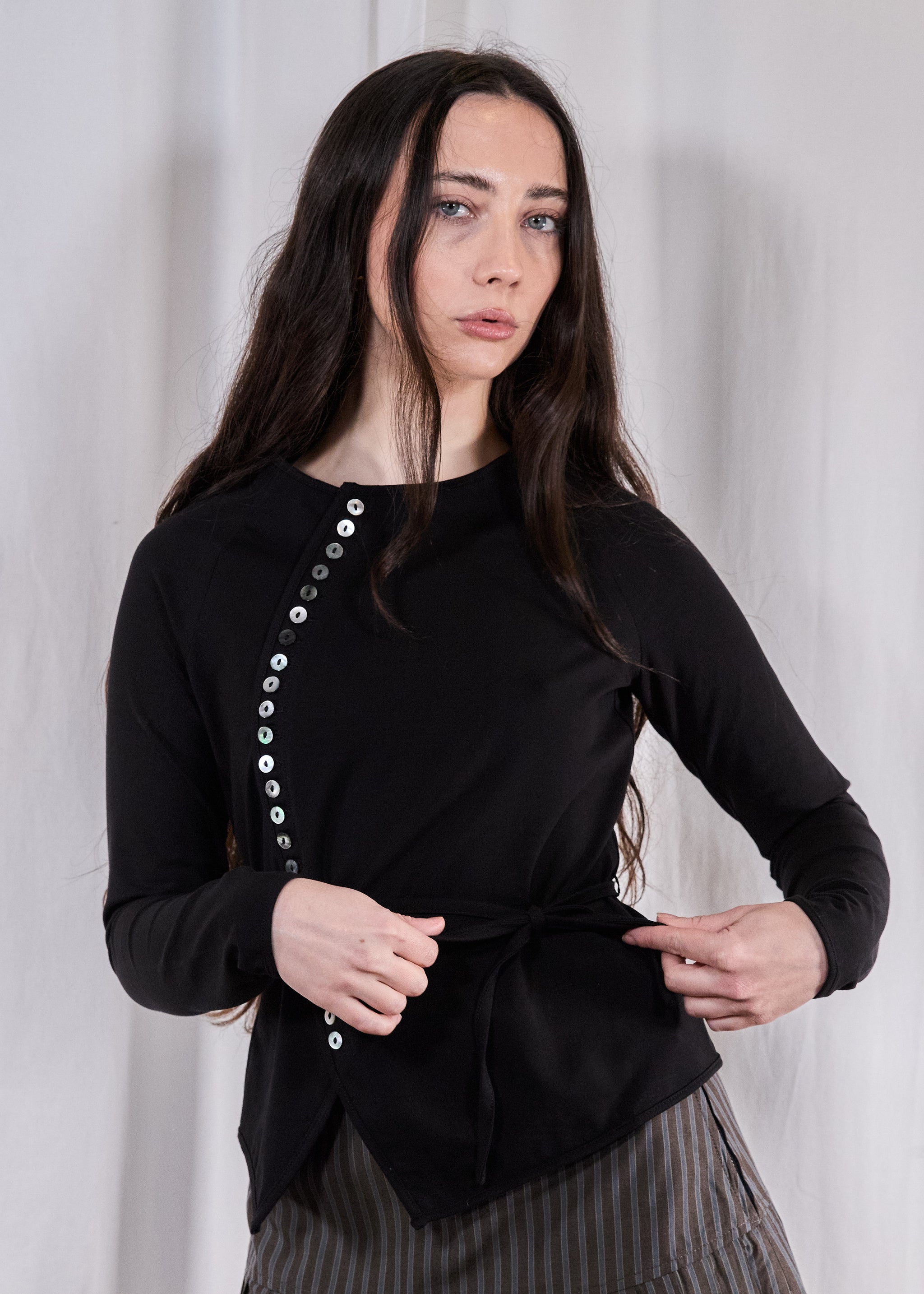 Curved placket cardigan with ties at waist